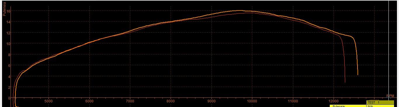 (Gráfica de ejemplo, carburador PE28 de serie (15,6cv) vs PE28 con filtro E-PE28 (16cv), hay que tener en cuenta que también elimina el bache entre las 6800 y 7500 rpm)